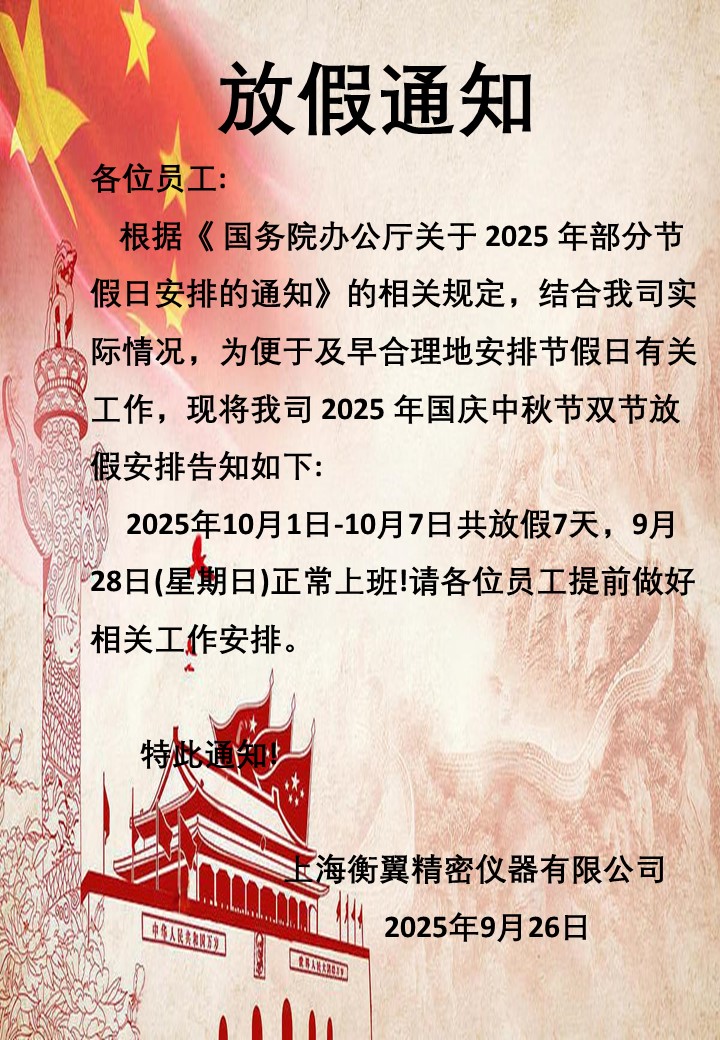 衡翼儀器2025年中秋國慶節放假安排的通知